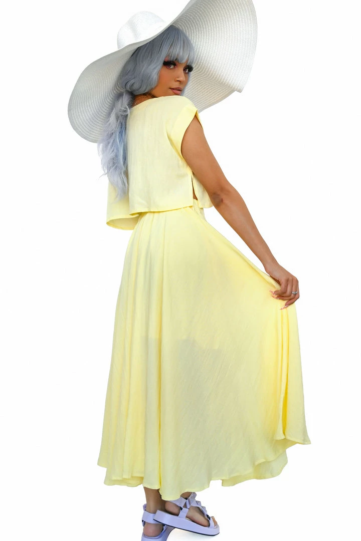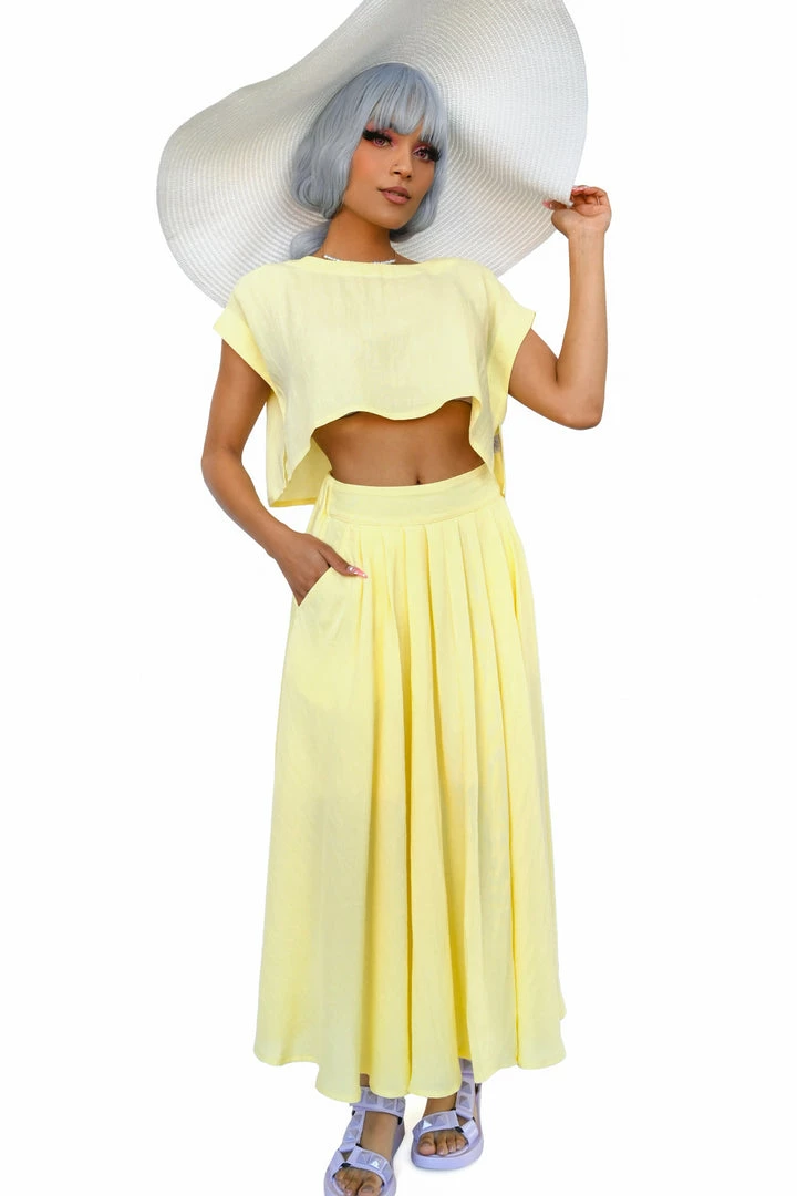 Meet me at the boardwalk! Sunny yellow linen like crop top and midi flare skirt.