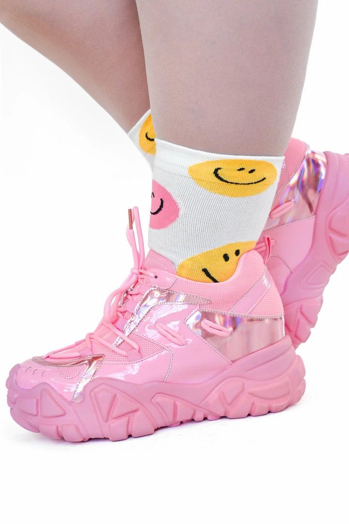 Don’t burst your bubble! These chunky pink platform sneakers feature hologram accents and a hidden wedge for extra height!
