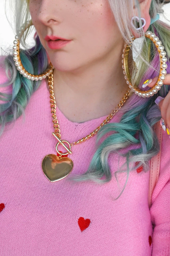 AÂ chunky gold heart sits on a thick gold chain with a toggle clasp closure