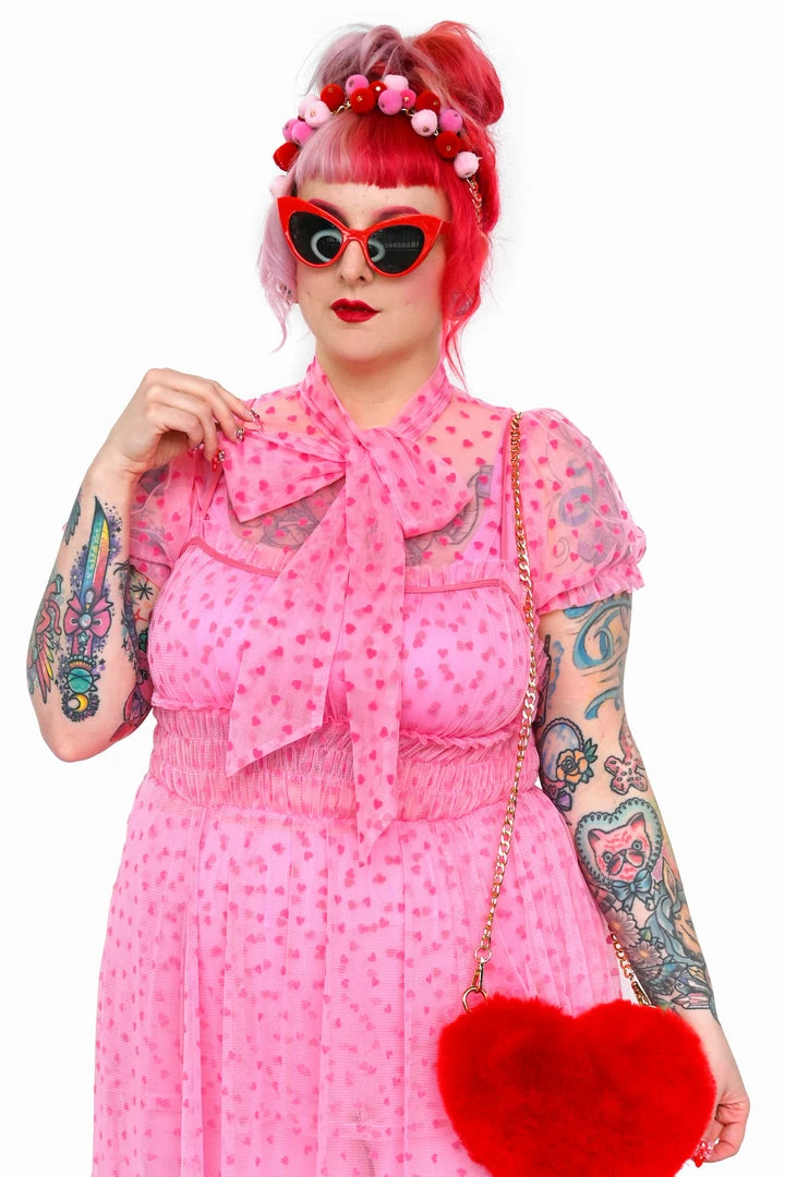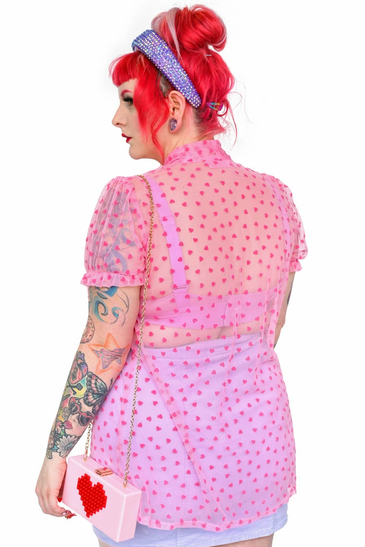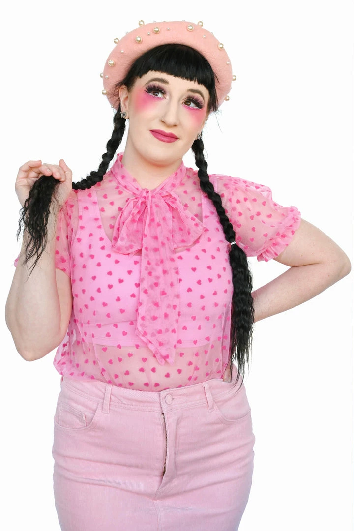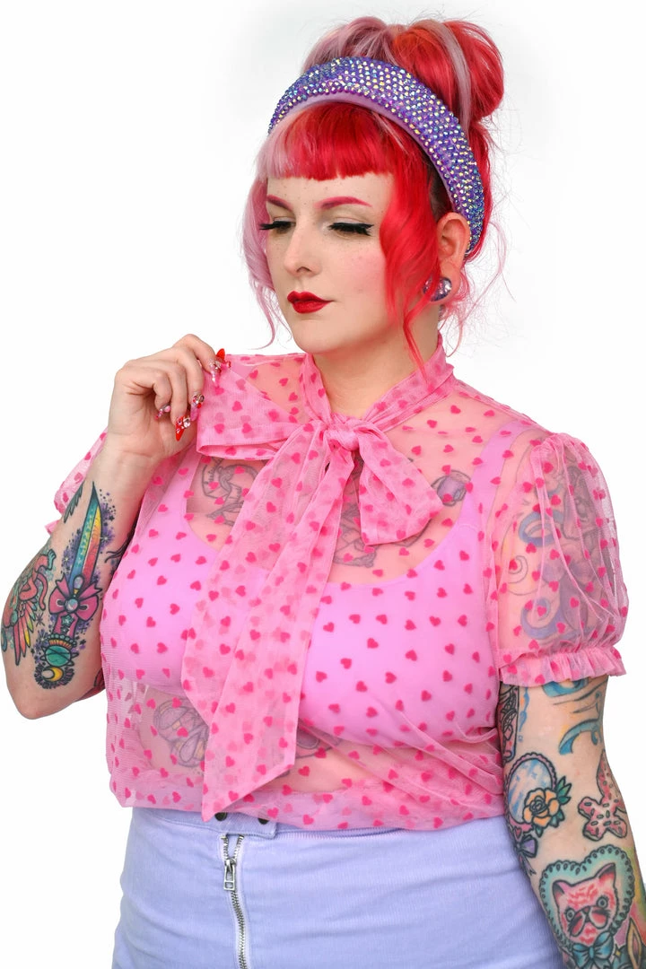 Adjustable pussy bow neck top with puff sleeves. Made of a high quality custom heart flocked mesh.