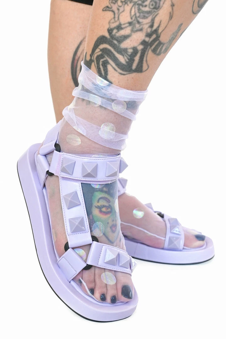 Lavender vegan leather sandals, with chunky lavender metal stud details across the straps.