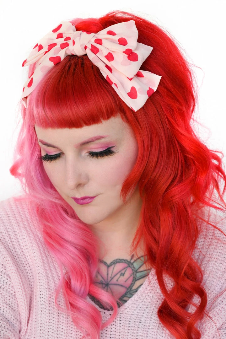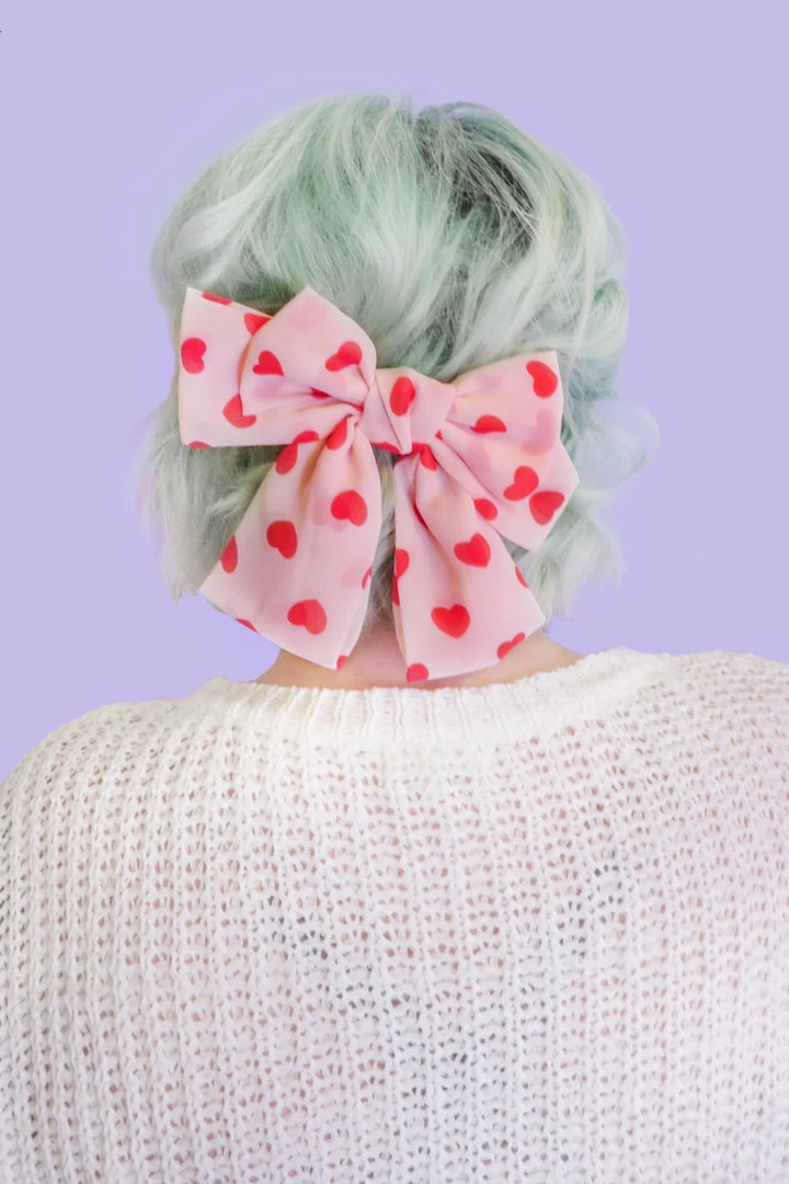 We are mega heart eyes for this bow! This bow is light pink with red hearts all over! Attaches with a 4″ barrette.