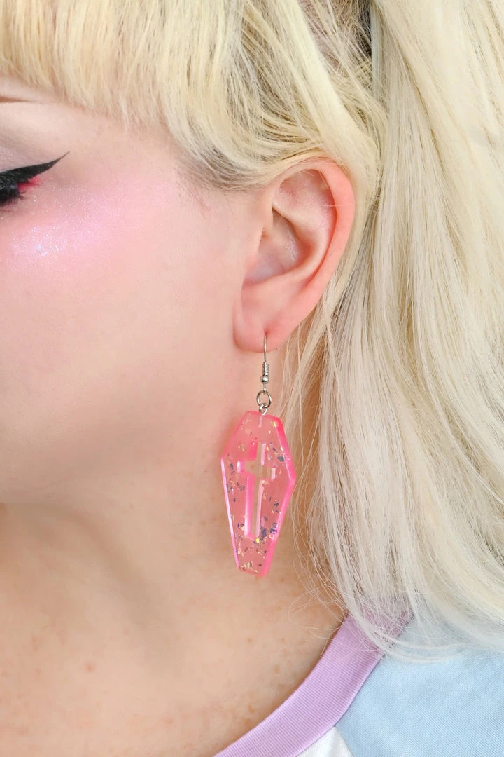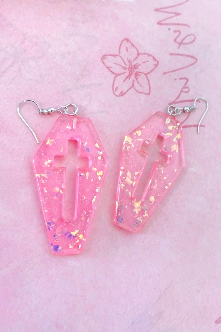 Hot pink semi transparent resin candy coffins with encapsulated iridescent holo foil and glitter.Â