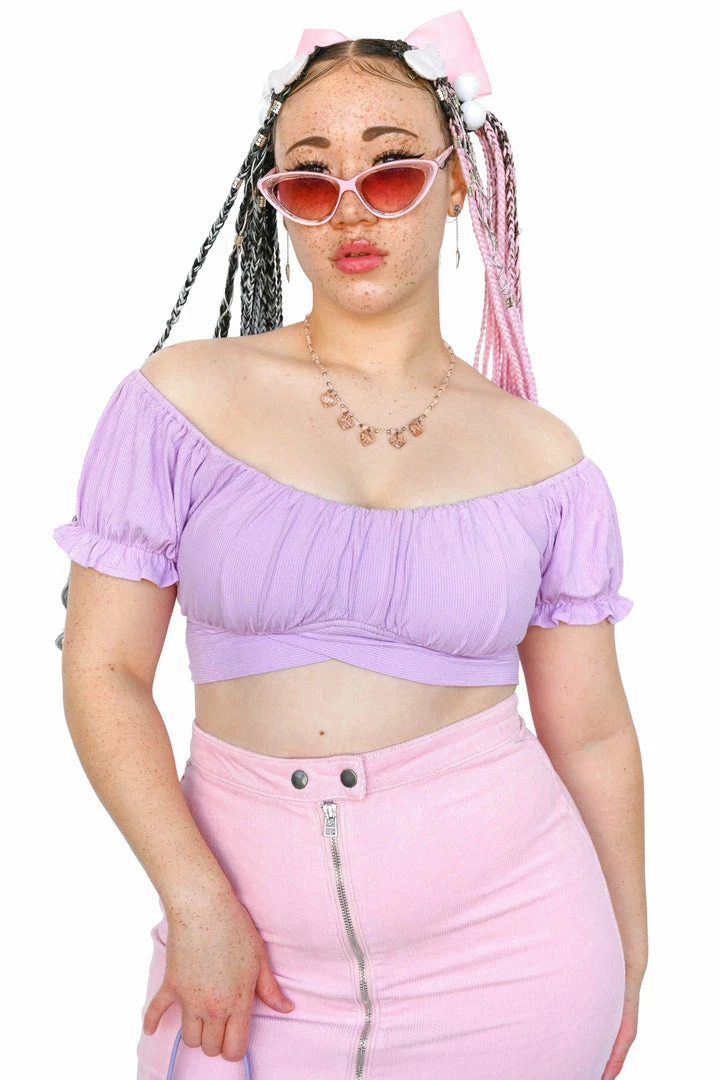 Super cute lavender crop top with pleats, ribbed fabric, ruffle sleeves, and back tie ribbon!Â