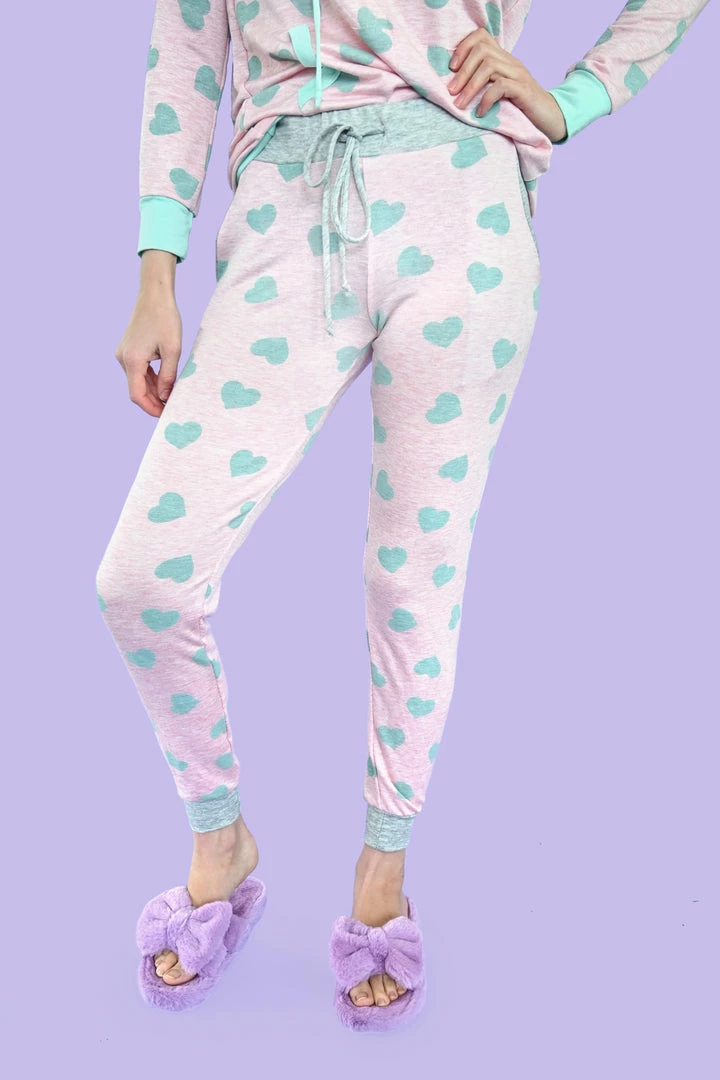 The perfect lightweight joggers do exist!! Pastel pink lounge joggers with mint hearts and a light grey trim.