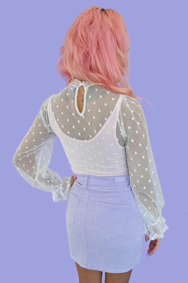 High neck sheer polka dot blouse made of soft, stretch mesh. Ruffle sleeves add a dramatic flair. Topped off with a dainty satin bow