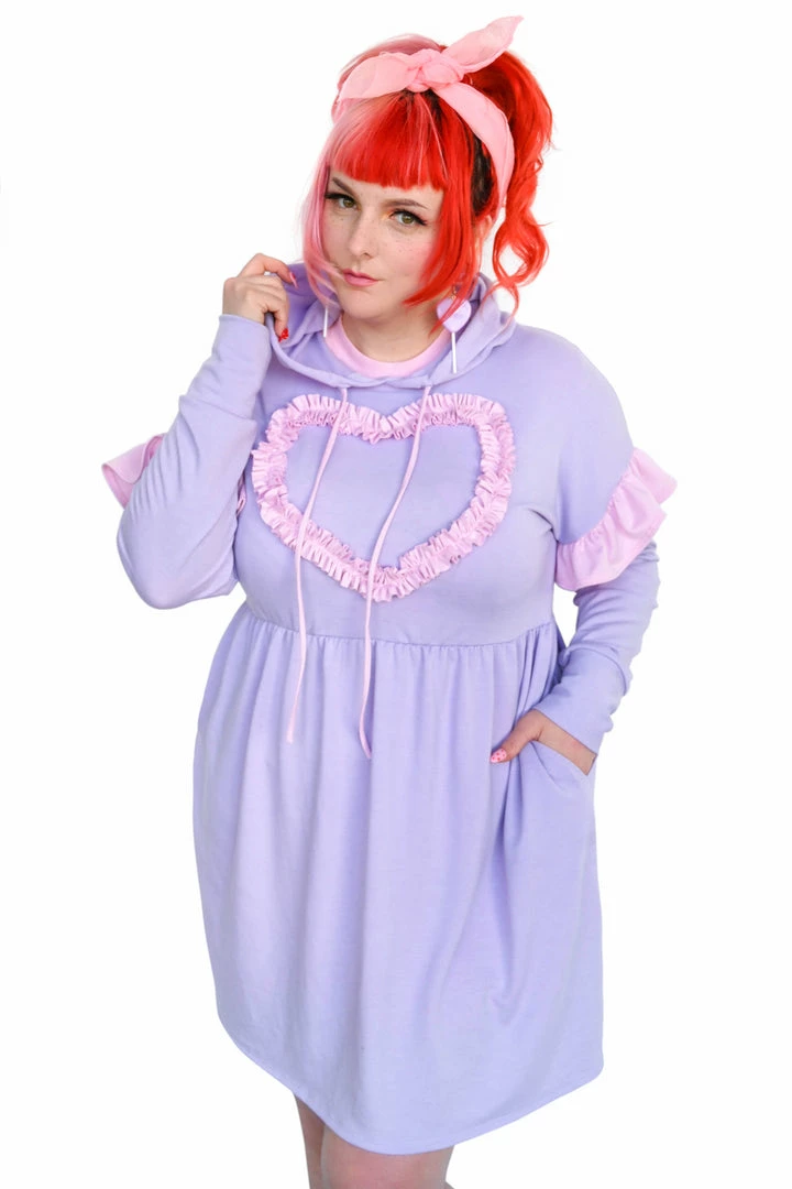 Ultra soft lavender hoodie dress with pockets and a soft pink ruffle heart on front!