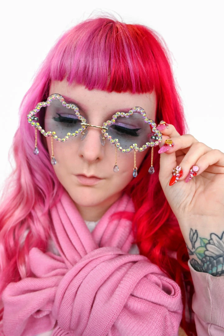 5 raindrop charms dangle from sparkly gemstone rimmed cloud sunglasses