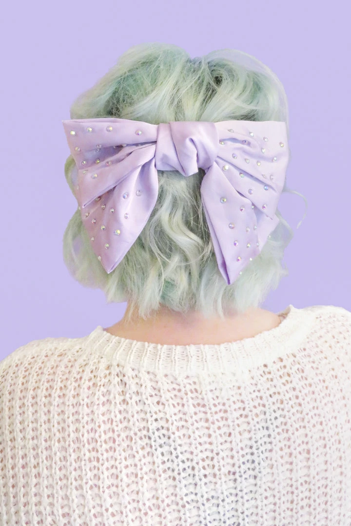This sweet satin bow is lavender with sparkly gems all over! Approx 7 in wide. Attaches with approx 4″ barrette.