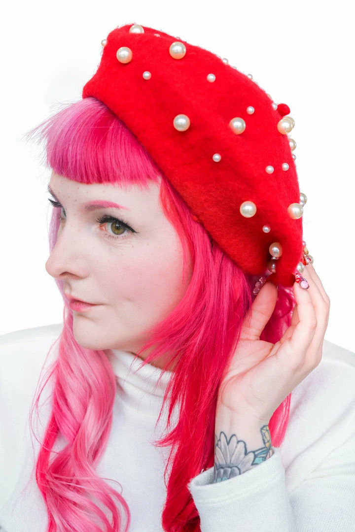 Red beret adorned with pearls.