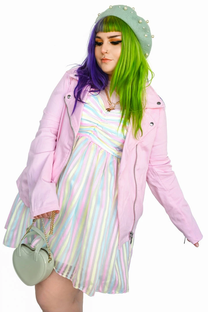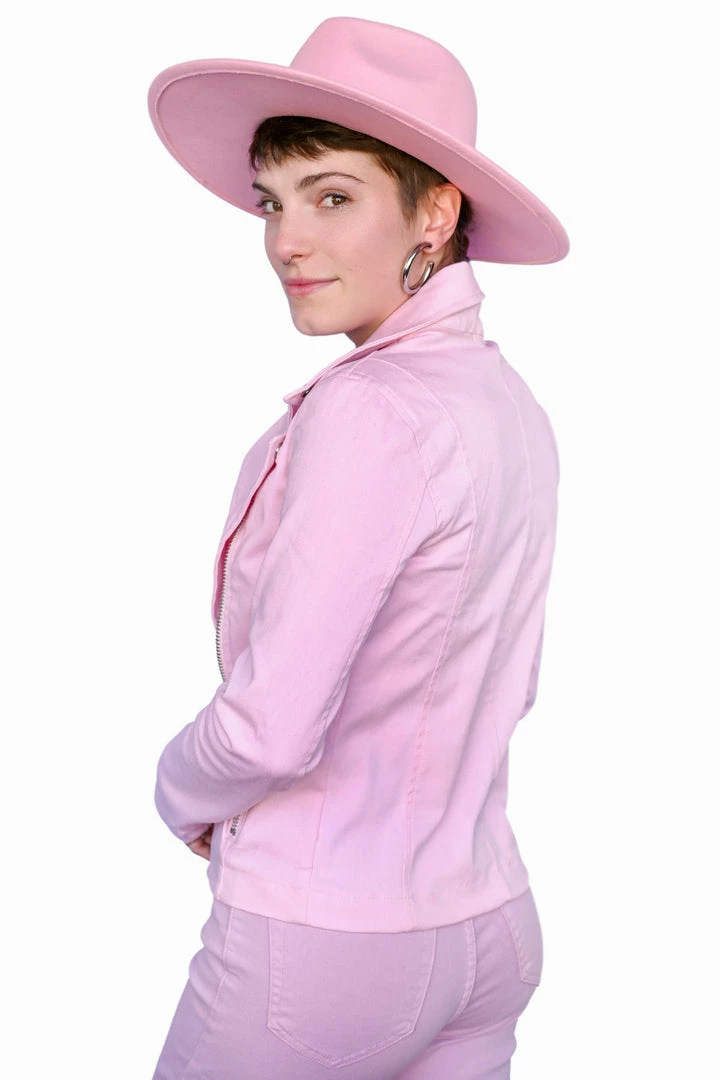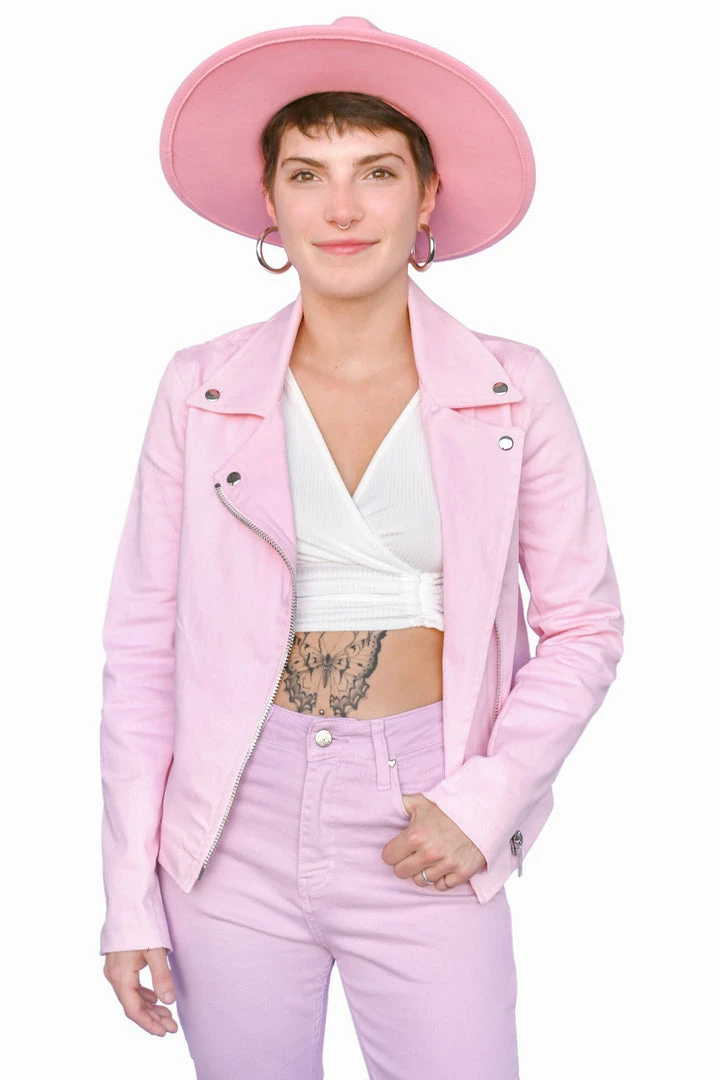A slightly oversized stretch pink denim motorcycle jacket just begging for all your pins and patches. A perfect blank to customize to your personality.
