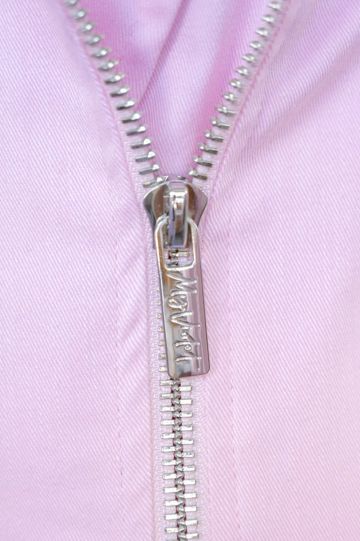 Silver color heavy metal zippers with My Violet branding. Zipper pockets and zipper cuff detail.