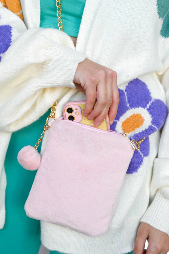 Phone, Keys, Wallet! All of the essentials fit into this perfectly pink plush crossbody pouch.Â