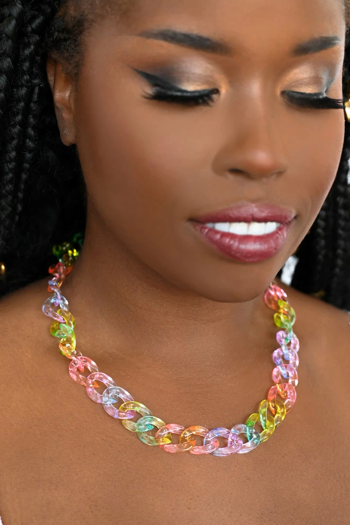 Add a little rainbow to your outfit and a little serotonin to your brain with this colorful acrylic necklace!