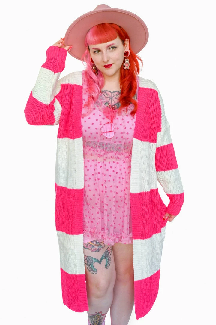This open front chunky knit cardigan is super soft and the brightest side of pink and white.