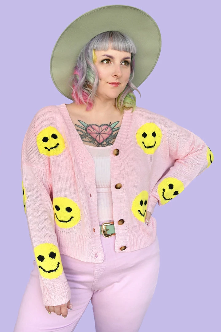 This one’s guaranteed to put a smile on your face! Lightweight cardigan with smiley face knit.Â