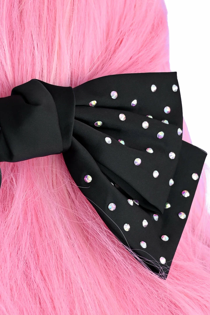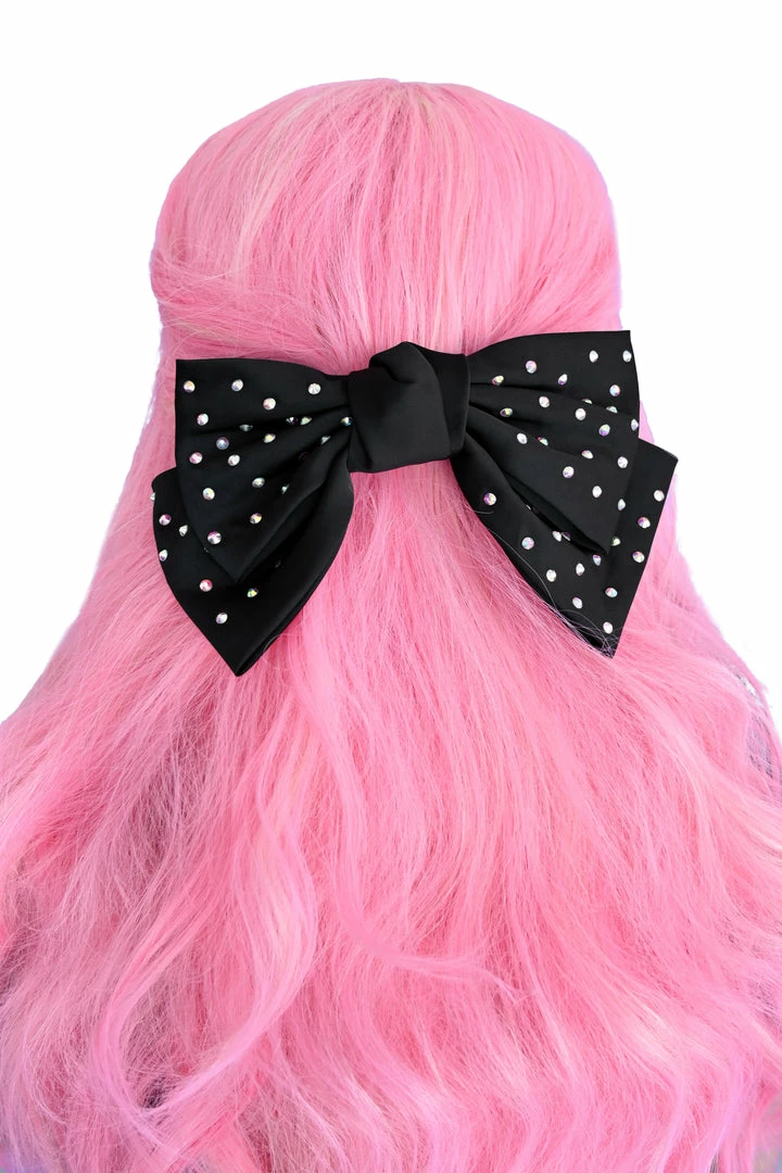 This sweet satin bow is periwinkle with sparkly gems all over! Approx 7 in wide. Attaches with approx 4″ barrette.