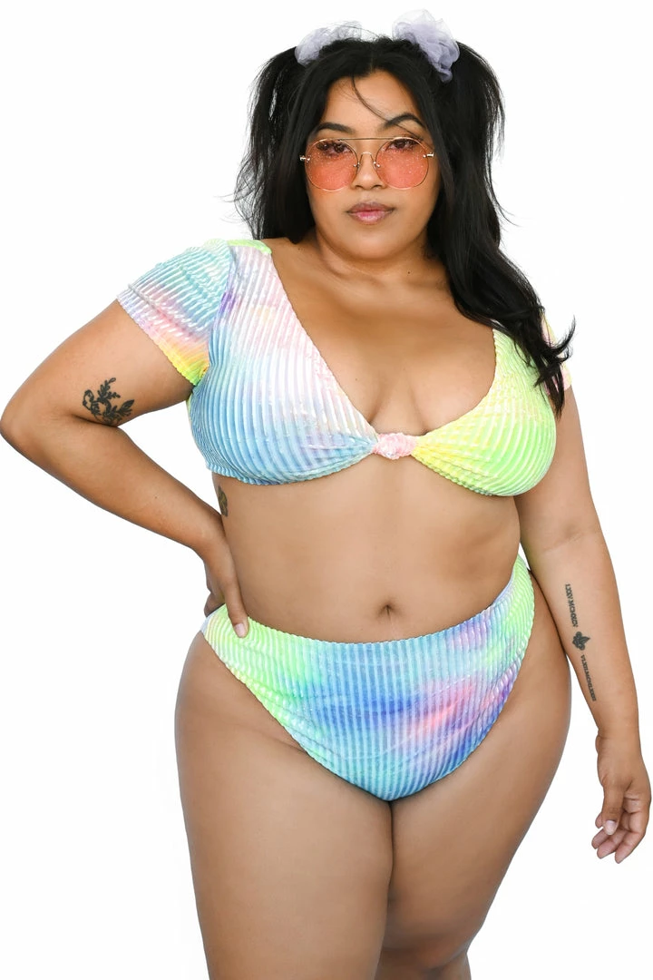 Extremely soft velvet and mesh stripes on a dreamy, tie dye rainbow. The top features  cap sleeves and a bow knot detail with flattering high cut bottoms.Â