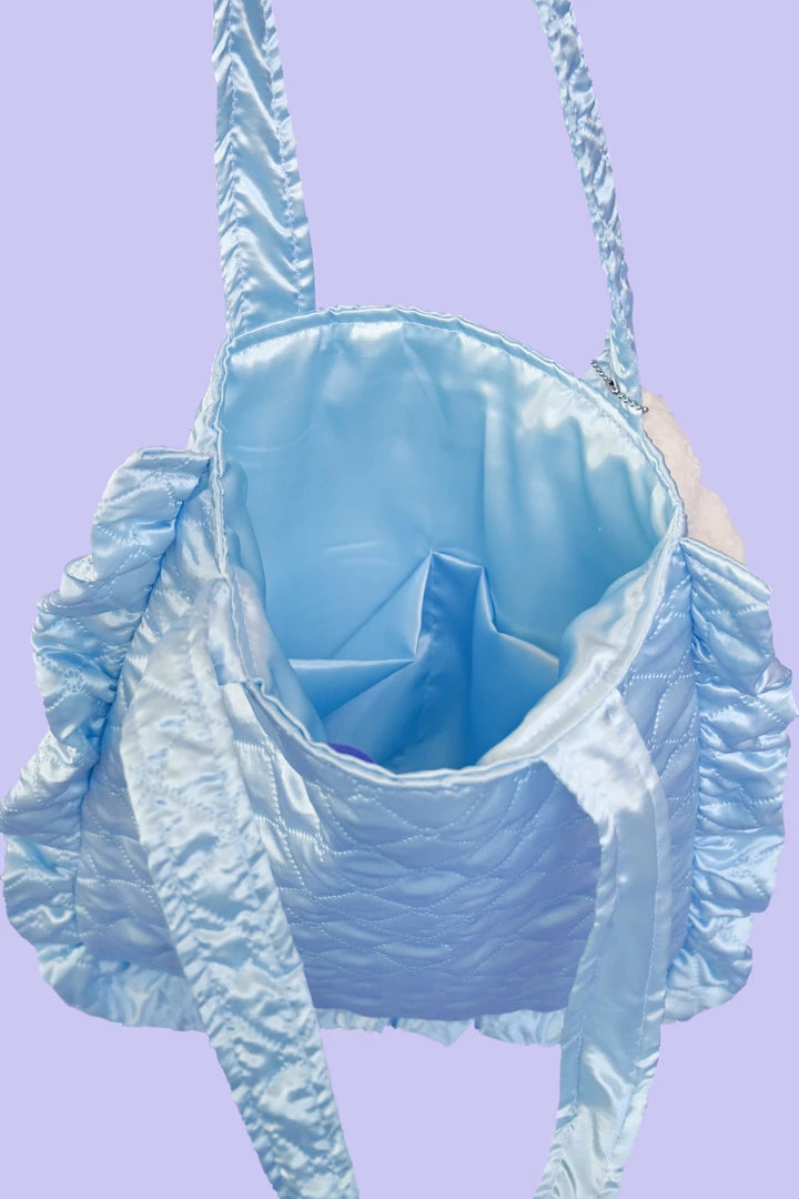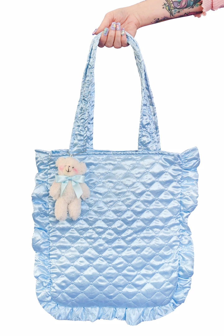 Soft quilted satin tote bag with a chunky ruffled edge. Comes with a removable matching bear friend!Â
