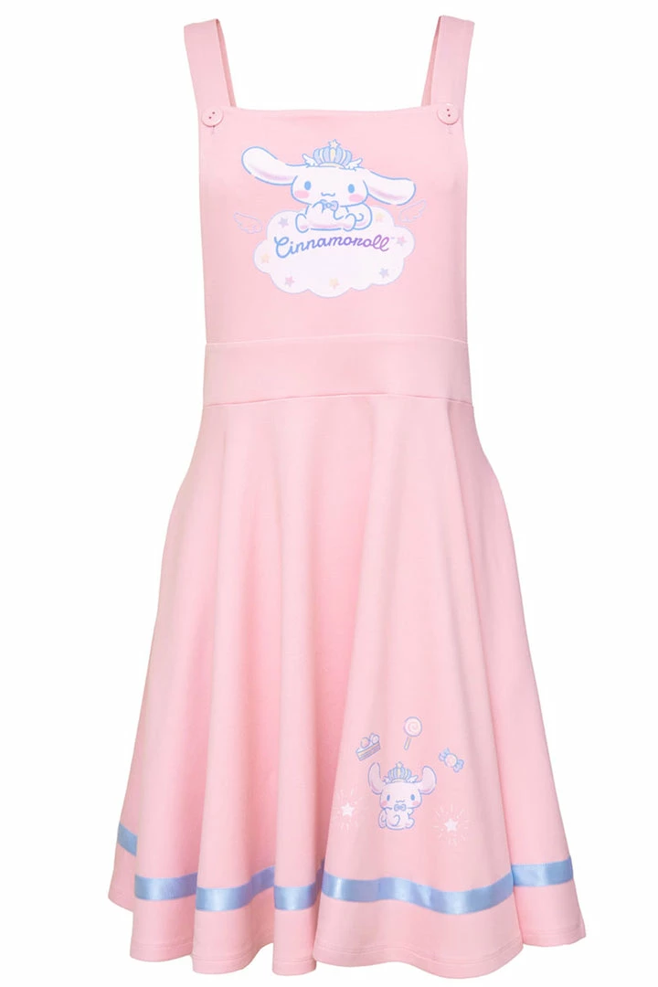 This JapanLA x Cinnamoroll Pinafore Dress features a pink pinafore dress with a cute print of Cinnamoroll on a cloud on the front. The skirt has a blue statin ribbon and print of Cinnamoroll with some yummy sweets. The pinafore dress straps have adjustable length buttons.