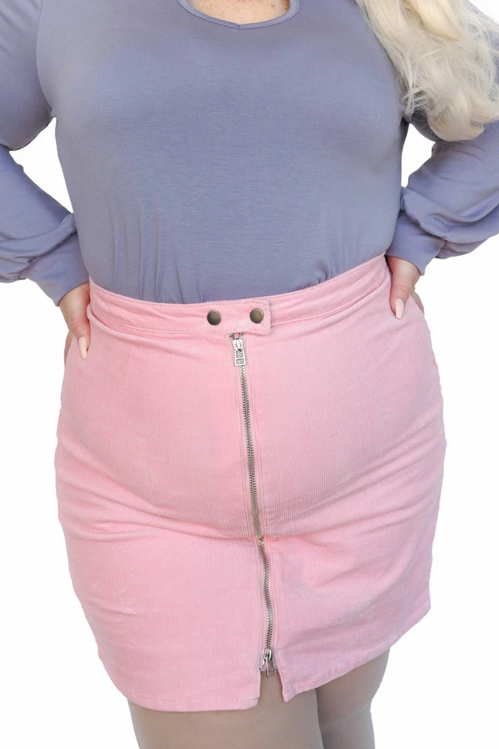 A classic zip up mini skirt made of soft corduroy with just enough stretch in a beautiful pink color.