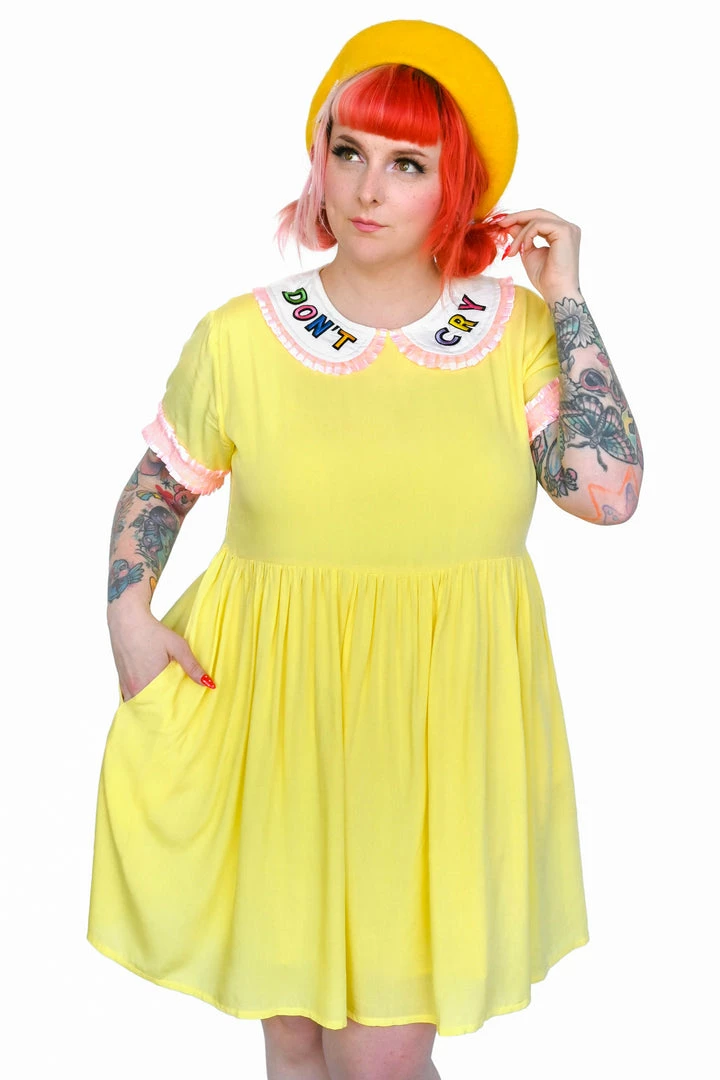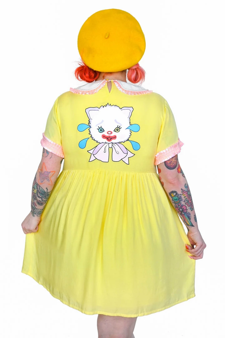 Loose & easy relaxed sack dress with embroidered collar, pink ruffle trim, and playful clown cat screen print on the back!Â