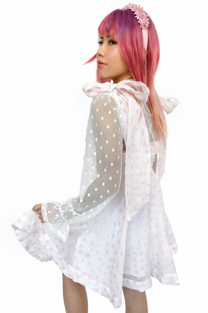 Bloom sweetly! Delicate white fit and flare mini dress with pink petal accents. Shoulder ties are extra long for versatile options!Â