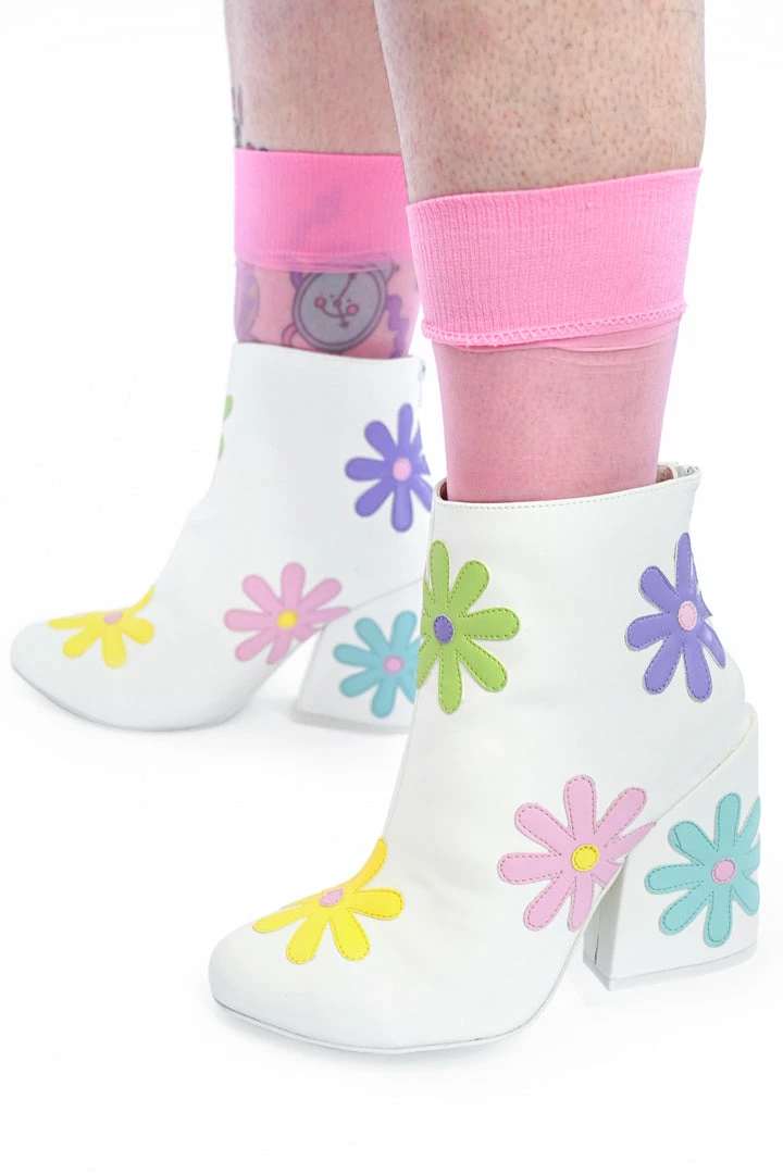 White faux-leather upper. Multi color pastel faux-leather daisy overlays (yellow, teal, pink, purple, green). White rubber outsole. Back zipper closure. US women’s sizing. Man-made materials.